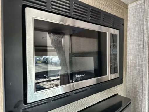 The kitchen area boasts efficiency, complete with a microwave and refrigerator. Meal prep on the road becomes simple and enjoyable.