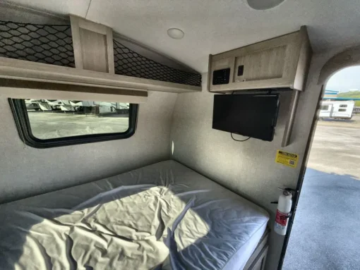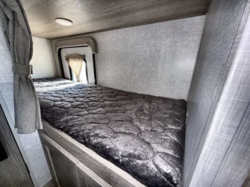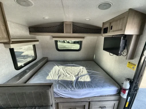 Storage solutions abound in this RV, from overhead compartments to under-bed storage. Keep your gear organized and accessible during your travels.