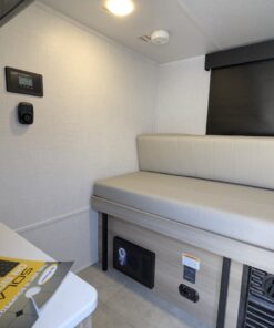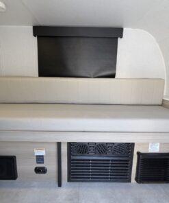 Inside, you’ll find a well-designed living space complete with a cozy dinette that converts into a bed. The kitchen area includes a two-burner stove and refrigerator for all your cooking needs.