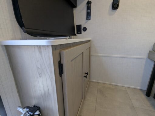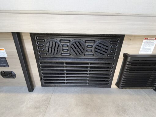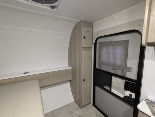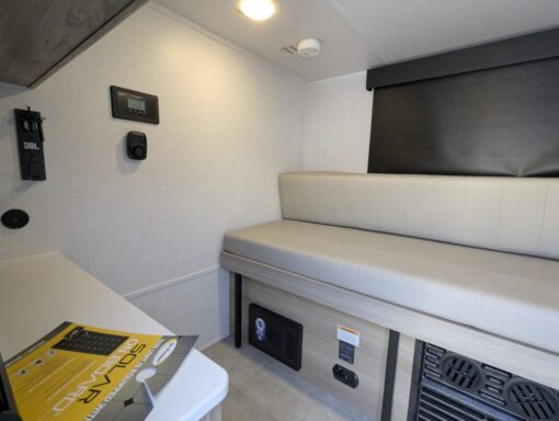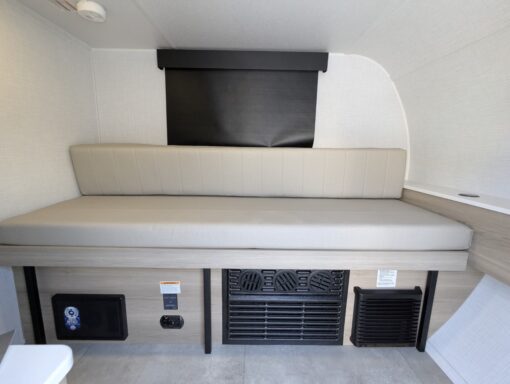 Inside, you’ll find a well-designed living space complete with a cozy dinette that converts into a bed. The kitchen area includes a two-burner stove and refrigerator for all your cooking needs.