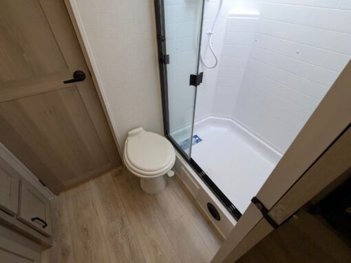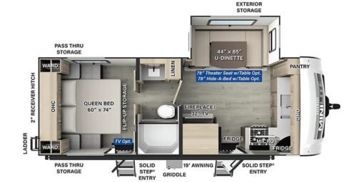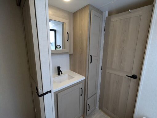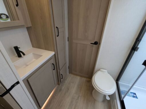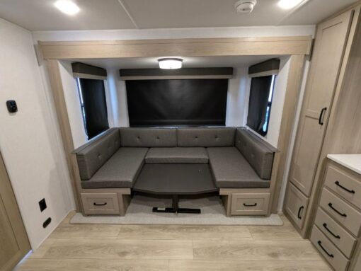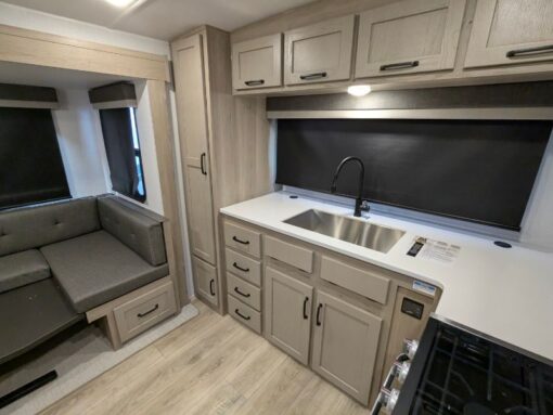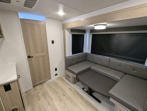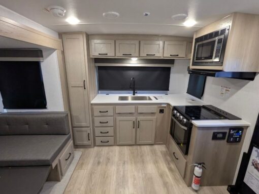 Equipped with ample storage options, this travel trailer ensures you can bring along all your essentials and more. The cozy sleeping areas provide restful nights after a day of adventure.