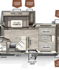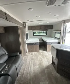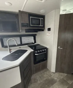 Step inside, and you’ll discover a cozy living space that doesn’t compromise on style. The slide-out dinette expands the interior, providing extra room to relax or enjoy meals together.