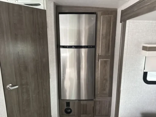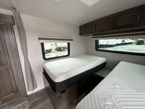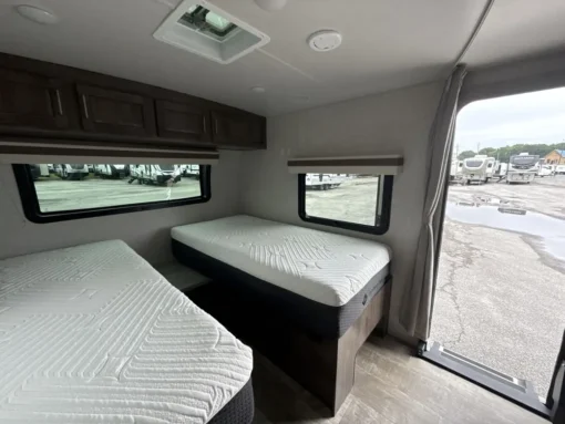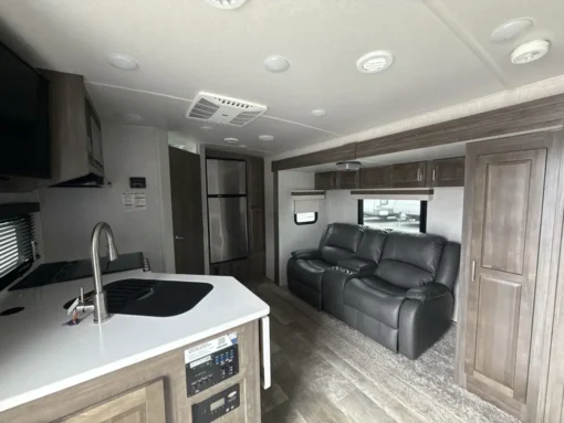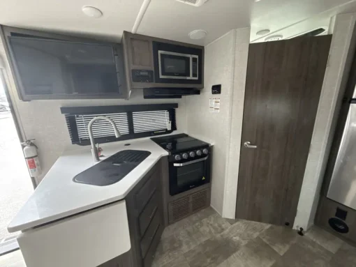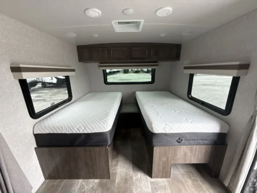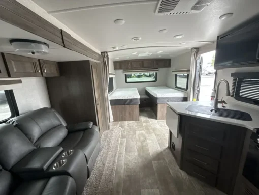Step inside, and you’ll discover a cozy living space that doesn’t compromise on style. The slide-out dinette expands the interior, providing extra room to relax or enjoy meals together.