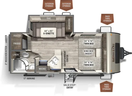 Sleeping arrangements are versatile too. This model offers comfortable sleeping options for up to four people thanks to its queen bed and convertible dinette.